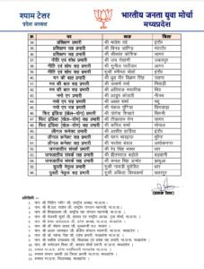 युवा मोर्चा में उपाध्यक्ष, महामंत्री, मंत्री, आईटी, सोशल मीडिया, प्रशिक्षण, नीति एवं शोध, नमो ऐप, फिट इंडिया, लीगल कनेक्ट, जनजातीय संपर्क और युवती नेतृत्व जैसे विभिन्न विभागों में कुल 50 से अधिक पदाधिकारियों की नियुक्ति की गई है। इसमें भोपाल, इंदौर, ग्वालियर, जबलपुर सहित प्रदेश के अधिकांश जिलों को प्रतिनिधित्व दिया गया है।