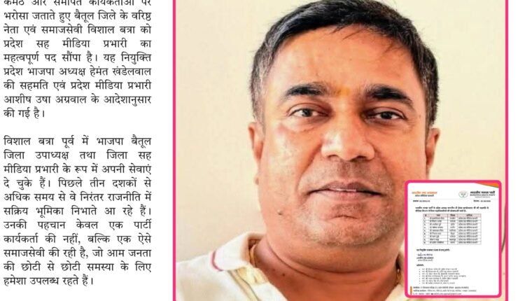 भोपाल / बैतूल । भारतीय जनता पार्टी (भाजपा) ने एक बार फिर अपने कर्मठ और समर्पित कार्यकर्ताओं पर भरोसा जताते हुए बैतूल जिले के वरिष्ठ नेता एवं समाजसेवी विशाल बत्रा को प्रदेश सह मीडिया प्रभारी का महत्वपूर्ण पद सौंपा है। यह नियुक्ति प्रदेश भाजपा अध्यक्ष हेमंत खंडेलवाल की सहमति एवं प्रदेश मीडिया प्रभारी आशीष उषा अग्रवाल के आदेशानुसार की गई है।