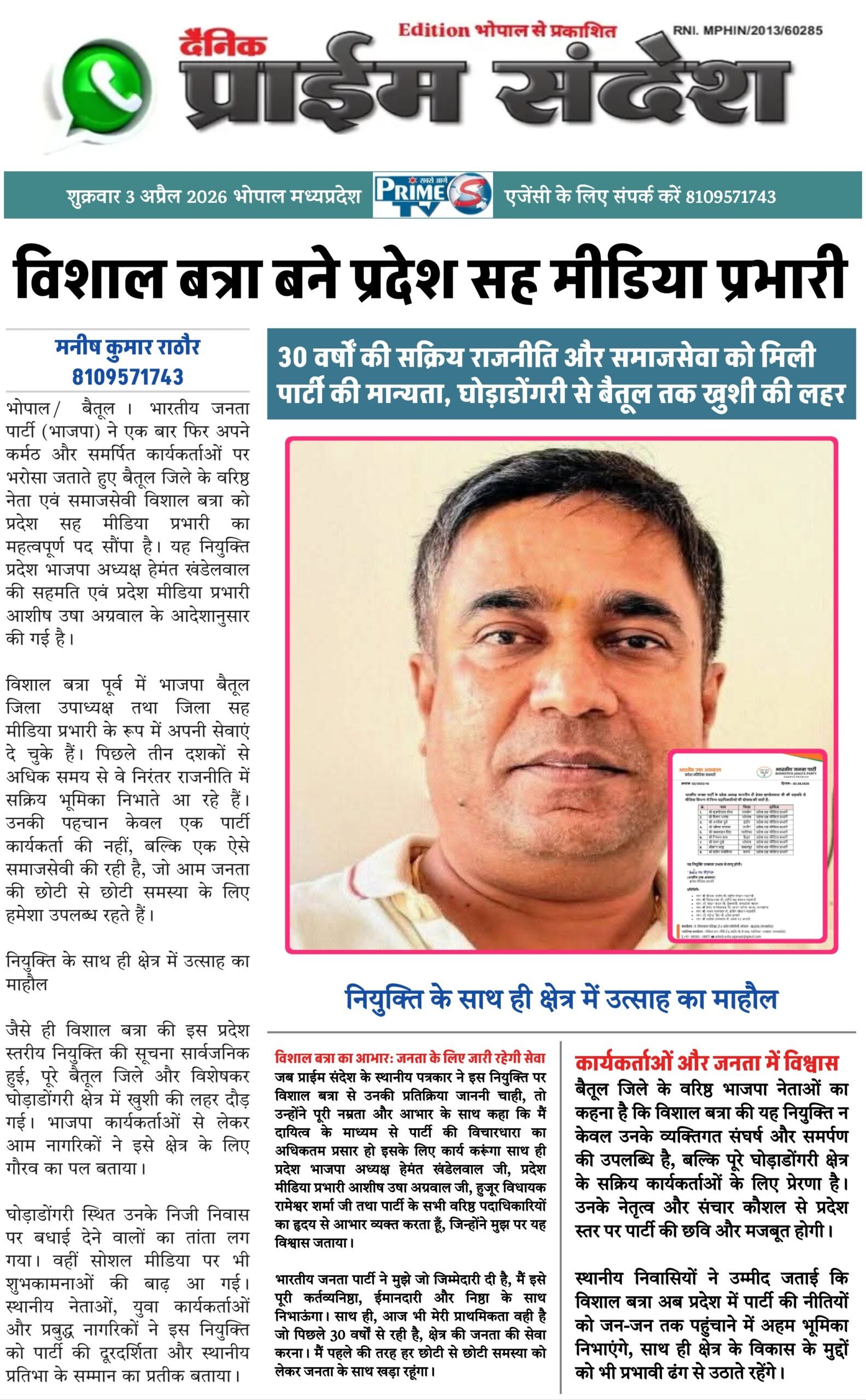 जब प्राईम संदेश के स्थानीय पत्रकार ने इस नियुक्ति पर विशाल बत्रा से उनकी प्रतिक्रिया जाननी चाही, तो उन्होंने पूरी नम्रता और आभार के साथ कहा कि मैं दायित्व के माध्यम से पार्टी की विचारधारा का अधिकतम प्रसार हो इसके लिए कार्य करूंगा साथ ही प्रदेश भाजपा अध्यक्ष हेमंत खंडेलवाल जी, प्रदेश मीडिया प्रभारी आशीष उषा अग्रवाल जी, हुजूर विधायक रामेश्वर शर्मा जी तथा पार्टी के सभी वरिष्ठ पदाधिकारियों का हृदय से आभार व्यक्त करता हूँ, जिन्होंने मुझ पर यह विश्वास जताया।