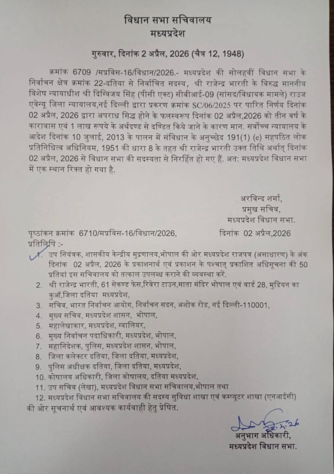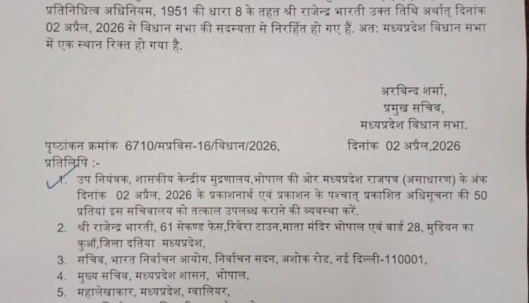 भोपाल / दतिया । मध्य प्रदेश में कांग्रेस के लिए जन्मदिन चुनौती बढ़ती ही जा रही है कांग्रेस के एक-एक कर विधायक काम होते जा रहे हैं दतिया से पूर्व गृह मंत्री को हराने वाले राजेंद्र भारती के विधायक की अब जा चुकी है । दतिया (निर्वाचन क्षेत्र क्रमांक 22) से कांग्रेस विधायक श्री राजेंद्र भारती को अपनी विधानसभा सदस्यता गंवानी पड़ी है। मध्य प्रदेश विधानसभा सचिवालय ने गुरुवार, 2 अप्रैल 2026 को इस संबंध में आधिकारिक अधिसूचना जारी कर दी है।