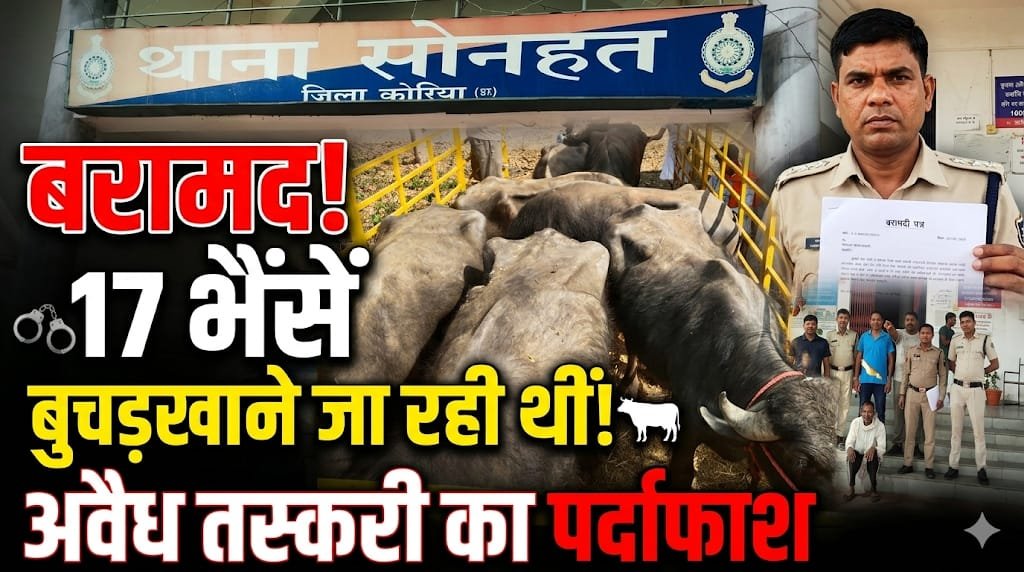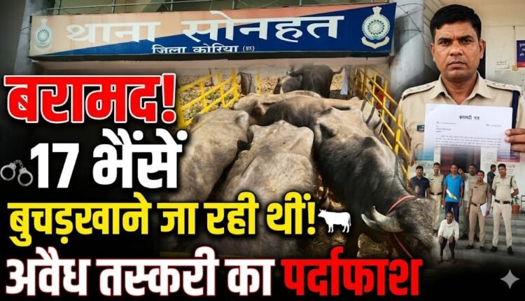 पुलिस अधीक्षक रवि कुमार कुर्रे के निर्देशन, एवंअतिरिक्त पुलिस अधीक्षक सुरेशा चौबे एवं अनुविभागीय अधिकारी (पुलिस) राजेश साहू के मार्गदर्शन में थाना सोनहत के थाना प्रभारी विनोद पासवान ने अवैध पशु परिवहन के खिलाफ बड़ी कार्रवाई करते हुए 17 नग भैंसा जप्त किया है