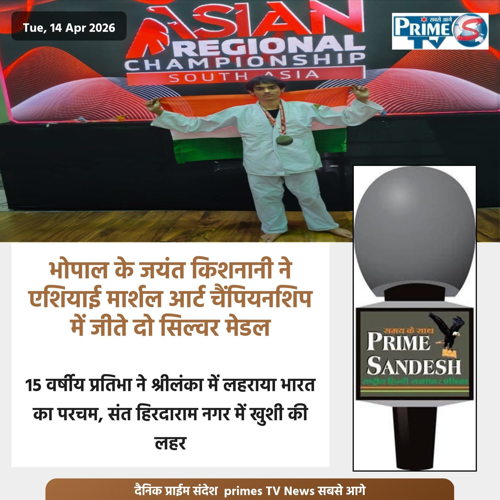 भोपाल के संत हिरदाराम नगर के होनहार खिलाड़ी जयंत किशनानी ने अंतरराष्ट्रीय स्तर पर शानदार प्रदर्शन करते हुए देश का नाम रोशन किया है। श्रीलंका में आयोजित तीसरी एशियाई रीजनल मार्शल आर्ट चैंपियनशिप में जयंत ने दो सिल्वर मेडल जीतकर भारत को गौरवान्वित किया।