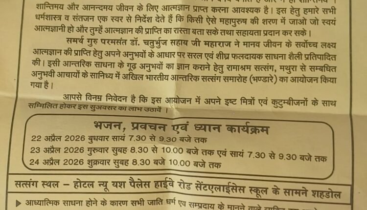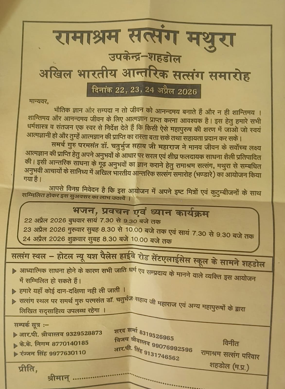 सत्संग स्थल – होटल न्यू यश पैलेस हाईवे रोड सेंटएलाईसेस स्कूल के सामने शहडोल