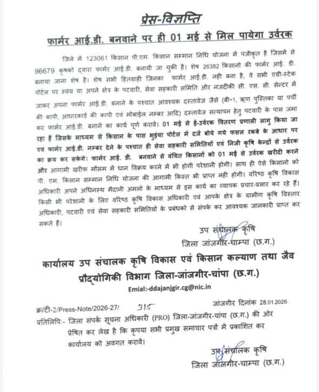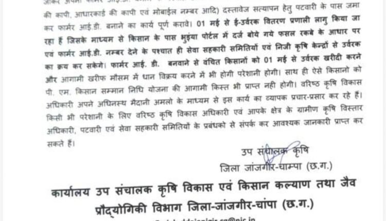 *फार्मर आई.डी. बनवाने पर ही 01 मई से मिल पायेगा उर्वरक*