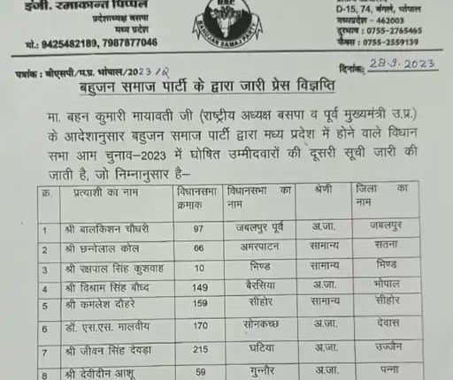 एमपी विधानसभा चुनावी : बसपा की दूसरी सूची में 9 प्रत्याशियों की घोषणा, कांग्रेस – भाजपा की क्या है स्थिति