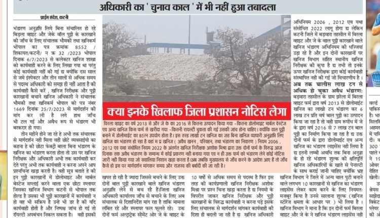 जिले में डोलोमाईट खनिज पर आधारित बाल पुट्टी कारखाने संचालित है जिसमे म प्र खनिज ( अवैध खनन , परिवहन, तथा भंडारण का निवारण ) नियम 2006 एव यथा संधोधित नियम 2022 लागू होता है l इन स्पष्ठ नियमो में प्रावधान है कि जहाँ भी खनिज का स्टॉक कर व्यवसाय किया जाएगा एव खनिज आधारित उत्पाद बनाएगा उन पर भंडारण अधिनियम 2006 , 2012 एव यथा संसोधित 2022 लागू होगा l लेकिन कटनी जिले में बड़वारा तहसील में विरला व्हाइट और जे के वाल पुट्ठी कारखाने वाले खनिज भंडारण अधिनियम की धज्जियां उड़ा रहे है और इन दोनों कारखानों पर खनिज विभाग सहित स्थानीय खनिज निरीक्षक की कृपा है l तभी तो इनके ऊपर खनिज निरीक्षक द्वारा कोई कार्यवाही संस्थापित नही की गई जो विचारणीय है l