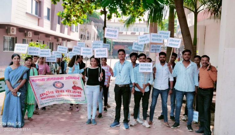 हरदा – लाल बहादुर शास्त्री व्यावसायिक अध्ययन महाविद्यालय, हरदा में दिनांक 18/10/2023 को आगामी विधानसभा चुनाव 2023 में मतदान प्रतिशत बढ़ाने हेतु प्राचार्य डाॅ. राजीव खरे, कार्यक्रम अधिकारियों एवं समस्त शिक्षकों एवं विद्यार्थियों द्वारा मतदान जागरूकता के लिये रैली निकाली गई। शत् प्रतिशत मतदान करने के लिये विद्यार्थियों द्वारा नारे लगाये गये। तकती पर लिखे नारे के माध्यम से भी महाविद्यालय के आस-पास की जनता को जागरूक करने का प्रयास किया गया। अपने मतदान का प्रयोग करें और एक अच्छी सरकार बनाने में योगदान देने हेतु प्रेरित किया गया। रैली में महाविद्यालय के समस्त शिक्षक एवं विद्यार्थी शामिल रहें।