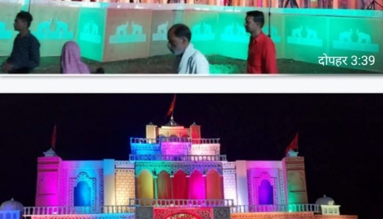 गोर परिवार की झांकी पर लगा यह बैनर हम आपका स्वागत करते हैं गोर परिवार द्वारा मां दुर्गे की विशाल प्रतिमा स्थापित की है प्रतिमा आकर्षण का केंद्र बिंदु है जिसे भक्त निहार रहे हैं कलाकारों द्वारा झांकी को भाव रूप दिया गया है हस्तकला देखते ही बनती है कई दिनों से कलाकार विशाल पंडाल को अंतिम रूप देने के बाद अब नित्य प्रतिदिन पंडाल को रूप में सज रहे इस बार गौर परिवार ने अयोध्या का राम दरबार पर मनमोहक झांकी की प्रस्तुति की है जिसे देखने के लिए गांव-गांव से लोग शाम से देर रात तक यह दृश्य देखने को मिलता है