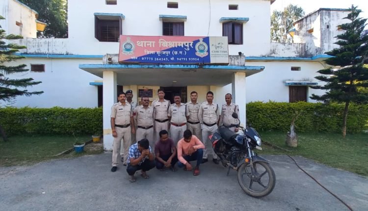 बिश्रामपुर एसईसीएल के रीजनल स्टोर में करीब 3 महीने पूर्व सुरक्षा कर्मियों की मौजूदगी में हुए 15 लाख रुपए के केवल डकैती मामले में विश्रामपुर पुलिस ने आज घटना के बाद से फरार 3 और आरोपियों को गिरफ्तार कर जेल भेज दिया है विश्रामपुर पुलिस ने बताया कि एसईसीएल विश्रामपुर क्षेत्र के रीजनल स्टोर में पिछले दिनों 11 अगस्त की मध्य रात्रि में अज्ञात आरोपियों ने सुरक्षा कर्मियों की मौजूदगी में करीब 14लाख रुपए के बेश कीमती केवल की डकैती की गई थी जिसकी कीमत 14 लख रुपए से अधिक के 643 मी बैश कीमती कॉपर केबल की चोरी कर ली गई थी वही अब पुलिस ने आरोपियों द्वारा की गई थी घटना के बाद से फरार चल रहे तौफीक अंसारी पिता स्व हनीफ अंसारी उम्र 21 साल तालाबपारा शिवनंदनपुर थाना बिश्रामपुर शशिकांत यादव पिता पारस राम यादव उम्र 35 साल माइन्स कॉलोनी क्वार्टर नंबर 52 बिश्रामपुर थाना विश्रामपुर गौतम प्रसाद यादव पिता रामदुलार यादव उमर 38 साल चोपड़ा कॉलोनी स्कूल लाइन क्वार्टर नंबर 854 बिश्रामपुर थाना बिश्रामपुर को पड़कर पुलिस ने न्यायालय पेश कर दिया है बिश्रामपुर पुलिस ने बताया कि मामले में अब तक 17 बालिक एवं 1 अन्य नाबालिक आरोपियों को गिरफ्तारी कर चुकी है अभी भी मामले में अन्य लोग फरार बताए जा रहे हैं जिसकी पिताशजी की जा रही है वही इस मामले में धारा 457, 380 ,395, 412 समेत लोक संपत्ति नुकसान निवारण अधिनियम 1984 की धारा 3 एवं 4 तथा 25 आमर्स एक्ट के तहत अपराध दर्ज है