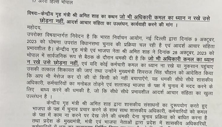 केन्द्रीय गृह मंत्री अमित शाह द्वारा शासकीय संसाधनों का दुरूपयोग करते हुए भाजपा के पक्ष में चुनाव प्रचार करने के साथ साथ शासकीय अधिकारी, कर्मचारियों को कमल के पक्ष में काम ना करने पर देख लेने की धमकी देना चुनाव प्रक्रिया को बाधित करना है तथा प्रदेश के मुख्यमंत्री, मंत्री एवं भाजपा नेताओं द्वारा प्रदेश में शासकीय अधिकारियों, कर्मचारियों में भय का वातावरण निर्मित किया जा रहा है जो कि संवैधानिक मूल सिद्धांतों के विपरीत है । माननीय निर्वाचन आयोग से निवेदन है कि केन्द्रीय गृह मंत्री अमित शाह द्वारा भोपाल में दिनांक 28 अक्टूबर, 2023 को सार्वजनिक रूप से शासकीय अधिकारियों, को धमकाने एवं भाजपा के पक्ष में कार्य ना करने पर देख लेने की धमकी देकर उन्होंने प्रभावशील आदर्श आचार संहिता का खुला उल्लंघन किया है इसलिए उनके विरूद्ध प्रकरण दर्ज कर कार्यवाही की जावे जिससे कि विधानसभा के चुनाव का मतदान निष्पक्ष एवं रूप से सम्पन्न हो सके जो कि न्यायोचित होगा ।