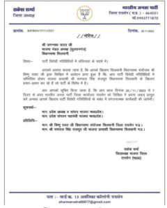 भाजपा जिला महामंत्री बलराम मालवीय को नोटिस,सांची विधानसभा क्षेत्र के भाजपा प्रत्याशी डॉ प्रभुराम चौधरी के खिलाफ चुनाव मे प्रचार करने पर नोटिस,पार्टी विरोधी गतिविधियों मे संलिप्त्ता पर सांची थमाया हे।भारतीय जनता पार्टी के जिला अध्यक्ष राकेश शर्मा ने नोटिस् जारी करते हुए। लिखित साक्षय देने को कहा हे ।