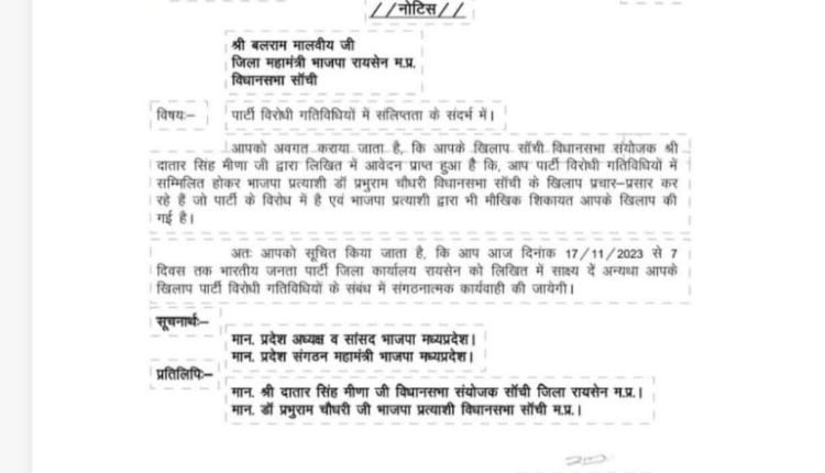 भाजपा जिला महामंत्री बलराम मालवीय को नोटिस,सांची विधानसभा क्षेत्र के भाजपा प्रत्याशी डॉ प्रभुराम चौधरी के खिलाफ चुनाव मे प्रचार करने पर नोटिस,पार्टी विरोधी गतिविधियों मे संलिप्त्ता पर सांची थमाया हे।भारतीय जनता पार्टी के जिला अध्यक्ष राकेश शर्मा ने नोटिस् जारी करते हुए। लिखित साक्षय देने को कहा हे ।