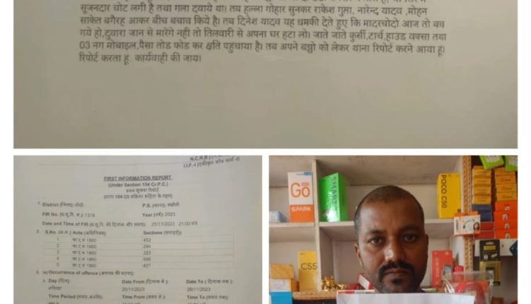 शिकायतकर्ता राम सिपाही कचेर पिता नंद किशोर कचेर उम्र 38 वर्ष निवासी ग्राम तिलवारी ने थाना मझौली में 26 नवंबर को शिकायत दर्ज कराया है जिसमें बताया गया है कि घटना दिनांक 25 नवंबर को शाम 6:30 बजे के लगभग की है। शिकायतकर्ता अपने साथ में परिवार के पीड़ित सदस्यों को भी थाने में लेकर आया था जिसमें लड़की दीपांजलि,लड़का नैतिक, मां तेरसिया एवं बहन रिद्धि कचेर साथ में थे।शिकायत में बताया गया है कि घटना दिनांक 25 नवंबर को अपने मोबाइल के दुकान में पुत्री दीपांजलि एवं पुत्र नैतिक को बैठाकर मझौली आ गया था शाम को लगभग 6:30 बजे उसका पुत्र नैतिक ने उसे मोबाइल से जानकारी दिया कि दिनेश उर्फ लाल यादव पिता लल्लू यादव निवासी ग्राम तिलवारी मुझे गंदी गंदी अश्लील गालियां दे रहा है तब मैंने कहा कि वीडियो बनाओ मैं आ रहा हूं और जब मैं दुकान में पहुंचा तो इलेक्ट्रॉनिक सामान और अन्य सामान टूटे बिखरे पड़े थे और मौके पर काफी लोग इकट्ठा थे नैतिक के बाएं हाथ के कलाई में छिलन दार चोट एवं गले एवं बदन में दर्द होना बताया। लड़की दीपांजलि ने बताई की शाम 6:30 बजे के करीब दिनेश यादव सुशीला सिंह के घर के तरफ से गंदी-गंदी गाली देते हुए दुकान में आया और तोड़फोड़ करने लगा जिसे मना करने पर मुझे रोड में दौड़ा दौड़ा कर तीन-चार डंडा पीठ और कमर में मारा है जिससे चोंट लगी है।दादी तेरसिया एवं छोटी बहन रिद्धि हल्ला गुहार करने लगी और बीच बचाव करने लगी तो दादी के दाहिने हाथ के कलाई में डंडा से मारा है जिसे सूजन दार चोट लगी है और बहन रिद्धि के सिर में डंडा मारा है जिसे भी सूजनदार चोट लगी है। तथा उसका गला भी दबाए हुए था। हल्ला गुहार सुनकर राकेश गुप्ता, मोहन साकेत, नरेंद्र यादव वगैरा आकर बीच बचाव किया तब दिनेश यादव अश्लील गाली देते हुए धमकी दे रहा था कि तिलवारी से अपना घर हटा लो नहीं तो इस बार बच गए हो दुबारा जान से मार दूंगा। जाते-जाते कुर्सी, टॉर्च, साउंड बक्सा, तीन नग मोबाइल एवं पैसा तोड़फोड़ कर क्षति पहुंचाया है। घटना की रिपोर्ट कर कार्रवाई की मांग की गई है। शिकायतकर्ता की शिकायत पर भारतीय दंड संहिता 1860 की धारा 452, 294, 323,506 एवं 427 के तहत अपराध कायम कर किया गया है।