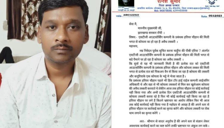 अखिल भारतीय पिछड़ा वर्ग संघ के धनबाद जिलाध्यक्ष रत्नेश कुमार ने झारखण्ड सरकार को पत्र लिखकर कहा की पीबी एरिया 7 अंतर्गत एसटीजी आउटसोर्सिंग कम्पनी के प्रबंधक हरियर चौहान की मिली भगत से बडे पैमाने पर हो रहा है कोयला का अवैध तस्करी ।