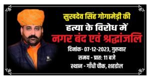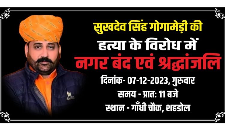 शहडोल- क्षत्रिय समाज का आवाहन रॉयल राजपूत संगठन के जिलाअध्यक्ष शिवम सिंह चंदेल ने जानकारी देते हुए बताया है कि बीते दिनों राजस्थान जयपुर में श्री करणी सेना के राष्ट्रीय अध्यक्ष श्री सुखदेव सिंह गोगामढ़ी जी की बदमाशों द्वारा गोली मारकर हत्या कर दी गई जिसके विरोध में क्षत्रिय समाज के द्वारा शहडोल नगर कल दिनांक-7- 11- 2023 दिन गुरुवार समय दोपहर 11:00 स्थान न्यू गांधी चौक शहडोल में नगर बंद का आह्वान किया गया है मुख्य रूप से क्षत्रिय समाज एवं सर्व समाज के सहयोग से नगर बंद के साथ-साथ विरोध प्रदर्शन किया जाना है साथ ही समाज के लोगों द्वारा ज्ञापन भी सौंपा जाएगा जाएगा क्षत्रिय समाज के लोगों ने सर्व समाज से आवाहन किया है कि सभी इस विरोध प्रदर्शन में शामिल होकर अपना सहयोग प्रदान करें ताकि इस कृत्य मैं शामिल अपराधियों को कड़ी से कड़ी सजा मिल सके एवं क्षत्रिय समाज ने अपील की है कि सभी व्यापारी वर्ग अपना सहयोग प्रदान करें।
