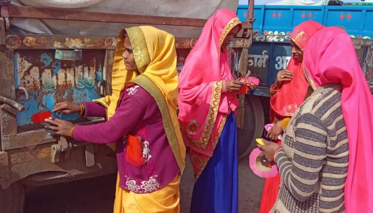 स्व-सहायता समूह की महिलाओं द्वारा ट्रेक्टर-ट्रालियों के पीछे लगाया जा रहा है रेडियम स्ट्रिप