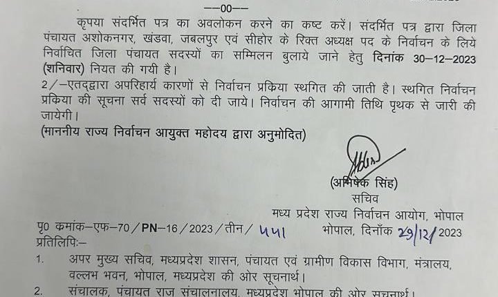 Breaking : मध्यप्रदेश राज्य निर्वाचन आयोग ने जिला पंचायत अध्यक्ष के चुनाव को किया स्थगित