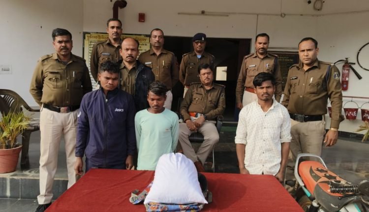 सूरजपुर। पुलिस अधीक्षक श्री आई कल्याण एलिसेला ने जिले के थाना-चौकी प्रभारियों को नशे के धंधे में लिप्त लोगों के विरूद्व सख्त कार्यवाही करते एवं क्षेत्र में सक्रिय मुखबीर का जाल फैलाने के निर्देश दिए थे जिसके बाद से ही जिले की पुलिस नशीली पदार्थ के गोरख धंधे पर सतत् निगाह बनाए हुए है। इसी तारतम्य में दिनांक 06.01.2024 को चौकी बसदेई पुलिस को मुखबीर से सूचना प्राप्त हुई कि 3 व्यक्ति डिलक्स मोटर सायकल में गांजा बिक्री करने हेतु दतिमा खोपा की ओर से बसदेई तरफ जाने वाले है।