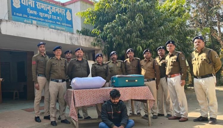 *सूरजपुर।* पुलिस अधीक्षक श्री आई कल्याण एलिसेला ने जिले के थाना-चौकी प्रभारियों को नशे के कारोबार में लिप्त लोगों के विरूद्व सख्त कार्यवाही के निर्देश पर जिले की पुलिस नशीली पदार्थ के गोरख धंधे पर सतत् निगाह बनाए हुए है। इसी तारतम्य में दिनांक 20.01.2024 को थाना रामानुजनगर पुलिस को मुखबीर से सूचना प्राप्त हुई कि एक व्यक्ति सूरजपुर की ओर से गांजा लेकर बिक्री करने हेतु आमगांव खदान की ओर आने वाला है।
