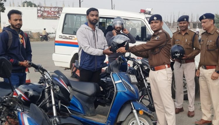 *पुलिस अधीक्षक ने लोगों को ट्रैफिक नियमों की जानकारी देकर बांटे हेलमेट।
