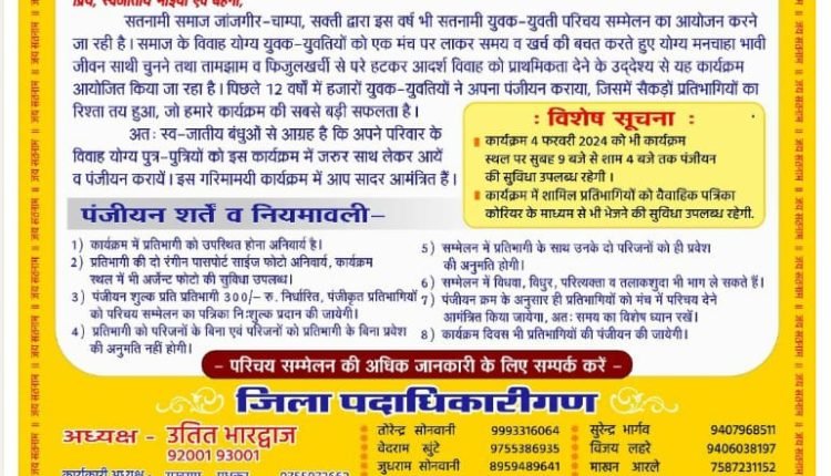 सतनामी युवक युवती परिचय सम्मेलन 4 फरवरी को — जांजगीर