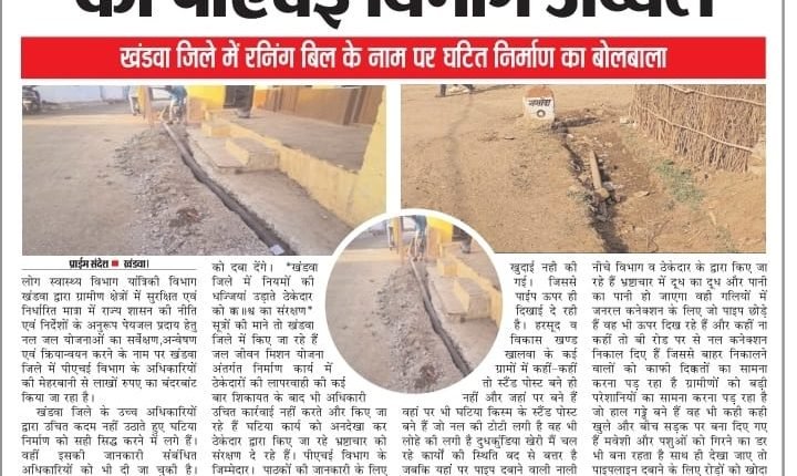 सूत्रों की माने तो खंडवा जिले में किए जा रहे हैं जल जीवन मिशन योजना अंतर्गत निर्माण कार्य में ठेकेदारों की लापरवाही की कई बार शिकायत के बाद भी अधिकारी उचित कार्रवाई नहीं करते और किए जा रहे हैं घटिया कार्य को अनदेखा कर ठेकेदार द्वारा किए जा रहे भ्रष्टाचार को संरक्षण दे रहे हैं। पीएचई विभाग के जिम्मेदार।