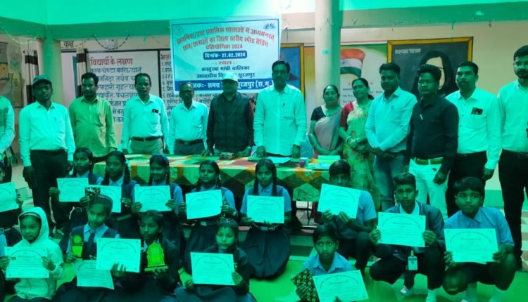 कार्यक्रम में शोभनाथ चौबे सहायक परियोजना समन्वयक द्वारा अपने उद्बोधन में समझ के साथ स्पीड रीडिंग के संबंध में प्रकाश डाला गया तथा भविष्य में आयोजित राज्य स्तरीय प्रतियोगिता में चयनित प्रतिभागियों को बढ़-चढ़कर हिस्सा लेने हेतु प्रेरित करते हुए प्रतियोगिता के विभिन्न चरणो ंपर सविस्तार प्रकाश डाला गया। इस प्रतियोगिता में विभिन्न विकासखण्डों से चयनित प्रतिभागियों में माध्यमिक स्तर से 08 बच्चे एवं प्राथमिक स्तर से 07 बच्चों ने भाग लिया। आयोजित कार्यक्रम में छात्र/छात्राओं के साथ उनके पालक एवं शिक्षक उपस्थित रहे। निर्णायक की भूमिका में माध्यमिक स्तर पर अमृत लाल कंवर, व्याख्याता, अनुरंजन केरकेट्टा (व्याख्याता) शासकीय हाई स्कूल नवापारा एवं मंजू पाणिग्रही (व्याख्याता) शासकीय कन्या उ.मा.वि. सूरजपुर तथा प्राथमिक स्तर में अनुज नारायण दुबे (संकुल समन्वयक) कन्या सूरजपुर मीना मगरे (शिक्षक) तथा माया कुमारी सिंह (शिक्षक) कस्तुरबा गांधी बालिका आवासीय विद्यालय सूरजपुर की भूमिका प्रमुख थी। माध्यमिक स्तर में प्रथम स्थान कु. नैन्सी टोप्पो, मा.शा. कोरोंधा, प्रतापपुर, द्वितीय स्थान लवकेश मा.शा. लाछा, सूरजपुर एवं तृतीय स्थान तरूण देवांगन सेजेस हिन्दी माध्यम विश्रामपुर एवं प्राथमिक स्तर में प्रथम स्थान कु. कविता भास्कर, प्रा.शा. केंवरा, प्रतापपुर, द्वितीय स्थान अंशिखा विश्वकर्मा प्रा.शा. विश्रामपुर एवं तृतीय स्थान लवली कुमारी पाटले प्रा.शा. बांधपारा, अनरोखा, भैयाथान ने प्राप्त किया। प्रथम, द्वितीय एवं तृतीय स्थान प्राप्त प्रतिभागियों को प्रतीक चिन्ह, प्रशस्ती पत्र एवं मेडल के माध्यम से तथा सभी प्रतिभागियों को सहभागिता प्रशस्ती पत्र एवं सामान्य ज्ञान की पुस्तक प्रदान कर सम्मानित किया गया। कार्यक्रम को सफल बनाने में मनोज कुमार मण्डल विकासखण्ड स्त्रोत समन्वयक, सुदर्शन राजवाड़े बीआरपी सूरजपुर, सुमन वर्मा, अधीक्षिका केजीबीव्ही सूरजपुर, सहदेव राम रवि सीएसी, गौतम शर्मा प्रधान पाठक, रामप्यारे पैकरा, प्रधान पाठक, अनिल, दादूराम टण्डन, राजेश सिंह रावत, नवल किशोर चौधरी, अनिल कुमार सिंह, अनिता बेक, सुचिता सिवानी खलखो, संतोष यादव, दिलिप कुमार श्रीवास्तव, राजाराम साहु, राम किशुन राजवाड़े, अमरसाय साहु, दीपक मिंज, शिक्षक/शिक्षिकाएं तथा अमरजीत तिर्की, सुदर्शन सिंह एवं बलराम ठाकुर, का सहयोग सराहनीय रहा। प्राइम्स सन्देश न्यूज से शत्रुघन तिवारी कि रिपोर्ट।