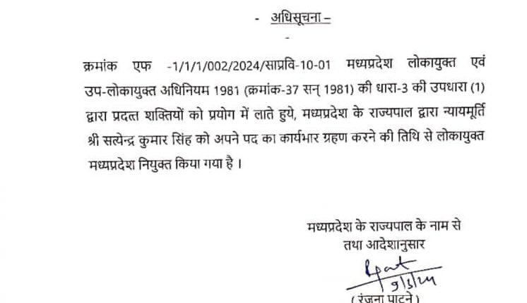 Breaking : मध्यप्रदेश सामान्य प्रशासन विभाग ने जारी किया आदेश, जस्टिस सत्येंद्र सिंह नए एमपी लोकायुक्त