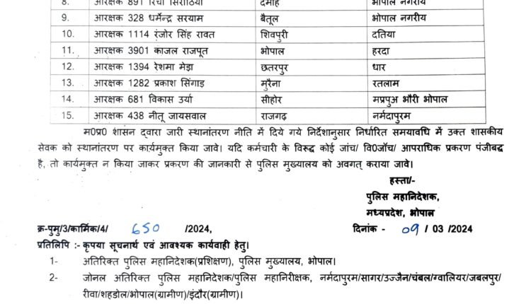 एमपी के अलग अलग जिलों के थाने में पदस्थ आरक्षक की सूची