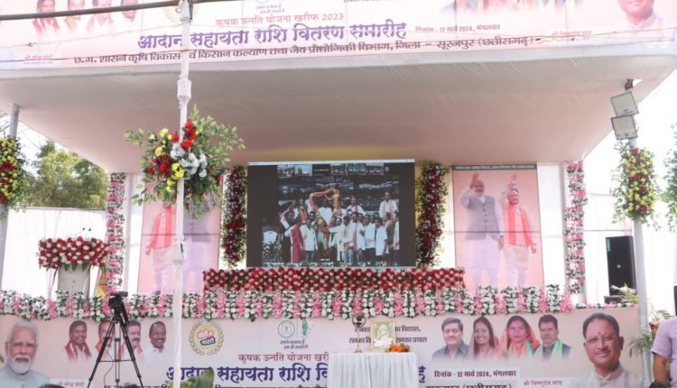 सूरजपुर/12 मार्च 2024/ आज कृषक उन्नति योजना अंतर्गत आदान सहायता राशि वितरण प्रदान करने के उद्देश्य से जिला स्तरीय कार्यक्रम स्टेडियम ग्राउंड शासकीय बालक उच्चतर माध्यमिक विद्यालय केतका रोड में आयोजित किया गया। कृषक उन्नति योजना अंतर्गत जिले में 54271 किसानों को उपार्जित धान के अंतर की राशि 300 करोड़ 62 लाख 45 हजार रूपए की राशि डीबीटी के माध्यम से किसानों के बैंक खाते में अंतरित की गई। जिसे मुख्यमंत्री श्री विष्णु देव साय ने सीधे कृषक बंधुओं के खाते में अंतरित की।