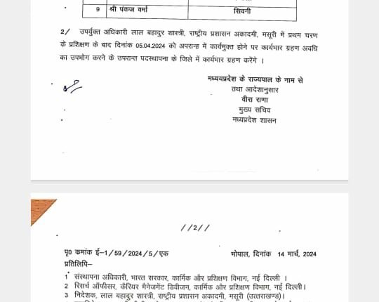 भोपाल । लाल बहादुर शास्त्री राष्ट्रीय प्रशिक्षण अकादमी मसूरी में प्रथम चरण में प्रशिक्षण समाप्ति पर राज्य में प्रशिक्षण के लिए 9 जिलों में धार, शाजापुर, उज्जैन, छतरपुर, रीवा अनूपपुर, नरसिंहपुर, मंडल, सिवनी में सहायक कलेक्टरों के पद पर इन अधिकारियों को प्रशिक्षण के लिए पोस्टिंग दी गई है।