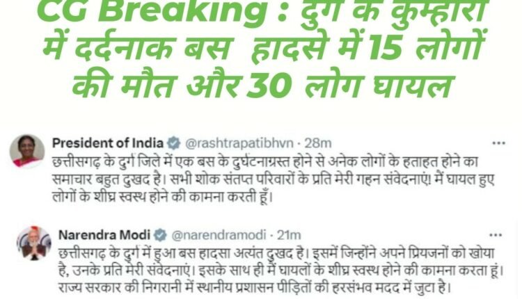CG Breaking : दुर्ग के कुम्हारी में दर्दनाक बस हादसे में 15 लोगों की मौत और 30 लोग घायल